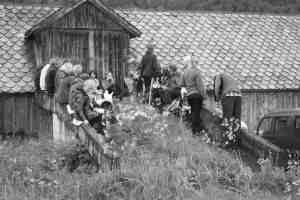 • Bilde, 2013. Slektstur i Sauda. Lunj på låvebroa på Herheim.