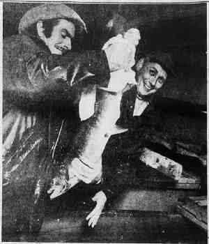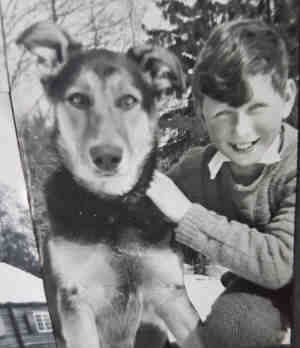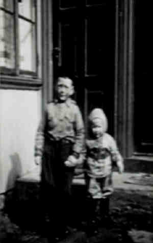 • Bilde, Ca. 1941, Horten. Far og Kari i Horten under krigen i klær sydd av gamle melsekker. Legg merke til at Kari har alt for store støvler, kunne ikke bøye seg.
